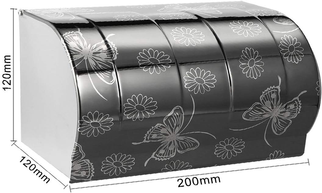 200mmx120mmx120mm 304 Stainless Steel Toilet Paper Holder w Cover Black1.304 stainless steel construction ensuring durability and dependability, while maintaining aesthetic appeal.2.Butterfly drawing to create a elegant look.3.Lid flap keeps tissue under cover away from possible water splashing.4.Used in kitchen, bathroom, toilet and many other place.5.Some install parts included.Specification:Product Name: Toilet Paper HolderPackage Content: 1 x Toilet Paper Holder, Some Install PartsMain Color: BlackMaterial: 304 Stainless SteelWeight: 506gDimension: 200 x 120 x 120mm / 7.87-inch x 4.72-inch x 4.72-inch(L*W*H)Mounting Hole Size: 5mm/0.2-inch(D)Mounting Hole Center Distance: 109mm/4.29-inchDescription in German200mmx120mmx120mm 304 Edelstahl-Toilettenpapierhalter mit Abdeckung schwarzDie Konstruktion aus 304 Edelstahl sorgt für Langlebigkeit und Zuverlässigkeit bei gleichzeitiger Ästhetik.Schmetterlingszeichnung für einen eleganten Look.Die Deckelklappe hält das Gewebe unter der Abdeckung Vo_n möglichen Spritzern fern.In Küche, Bad, WC und vielen anderen Orten verwendet.Einige installierte Teile enthalten.